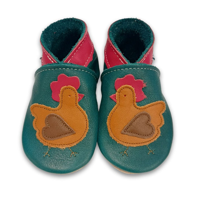 Adorable baby shoes in forest green, each adorned with a chicken. Made in Britain.