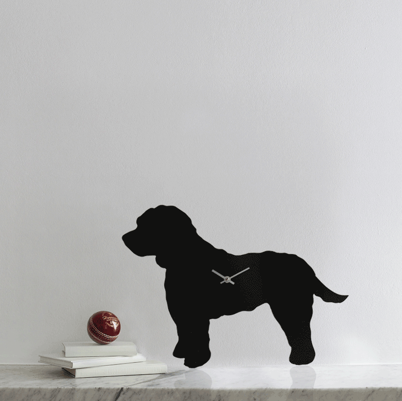 A fun cockapoo clock with tail that wags on the second. It is made of foamalux board with nickel hands. Comes complete with battery.