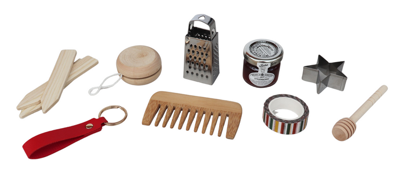 Much fatter than your average cracker, to accommodate six of the following high quality gifts: wooden honey drizzler, nutmeg grater, cookie cutter, faux leather keyring, wooden comb, washi tape, wooden plant labels, metal slinky, a wooden yoyo and mini strawberry jam (Tiptree by Wilkin & Sons).