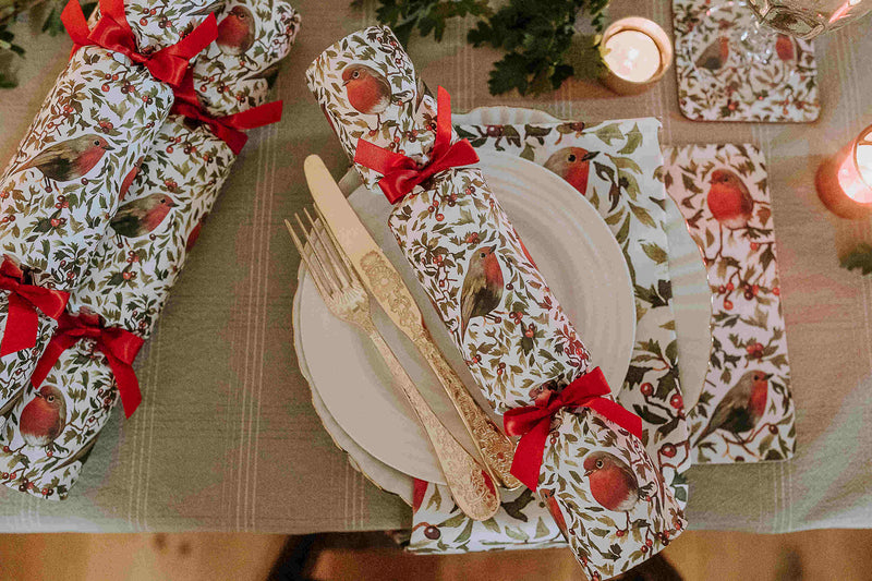 A set of six luxury Christmas Crackers, each featuring Robins design, with co-ordinating bows.