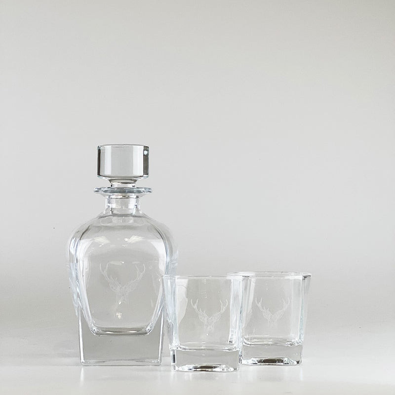 A stunning stag engraved decanter and pair of glasses set. The decanter and tumblers are tapered in shape, with heavy bases. Beautifully gift boxed - an exceptional gift for the discerning whisky drinker.