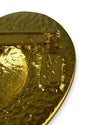 A vintage iconic Yves Saint Laurent abstract heart brooch. The central textured heart is surrounded by polished gold metal with black cursive text reading 'Yves Saint Laurent'.