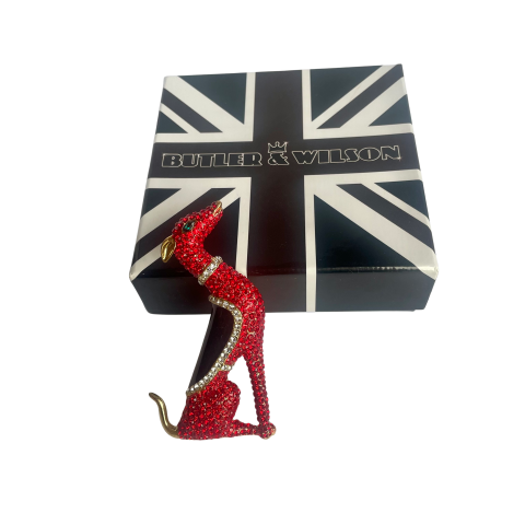 An elegant Art Deco style Butler & Wilson sitting greyhound brooch set with rich ruby red pavé crystals. The greyhound wears a black enamel coat, accented with sparkling clear crystal accents and wears a clear crystal collar. The dog has a distinctive green crystal eye.