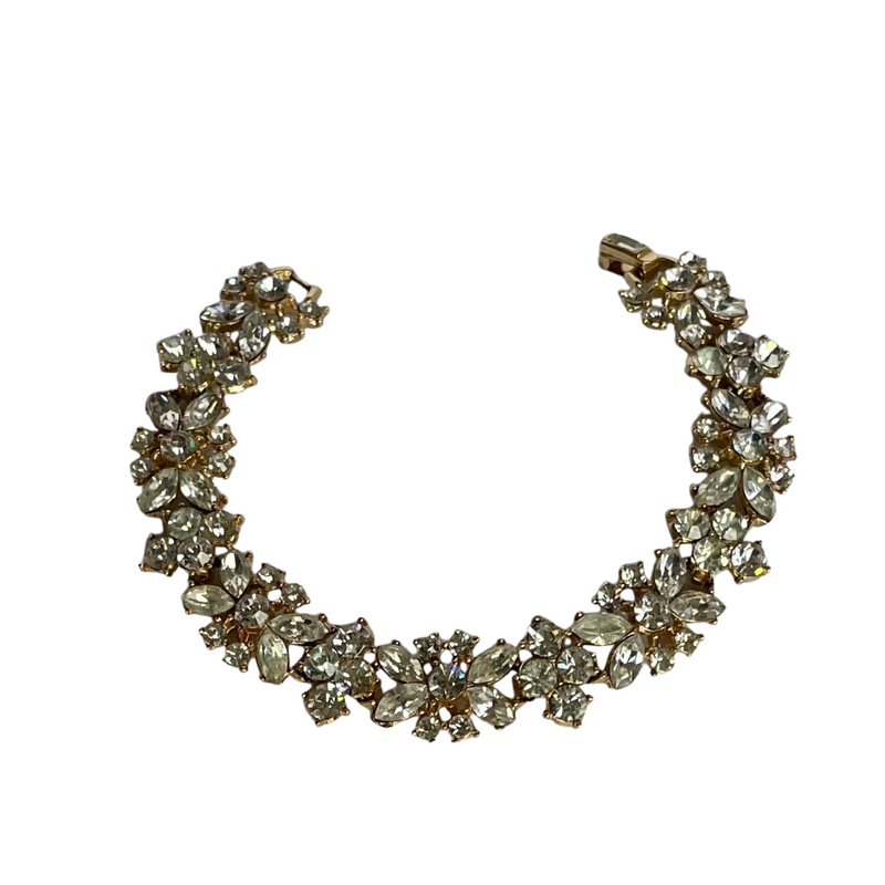This bracelet was produced by Trifari in the 1950s during the celebrated Alfred Philippe era. Featuring an elegant floral design, the bracelet is set with brilliant clear crystals in both round and marquise cuts, all securely prong-set in a high-quality Trifanium - gold-tone - finish.