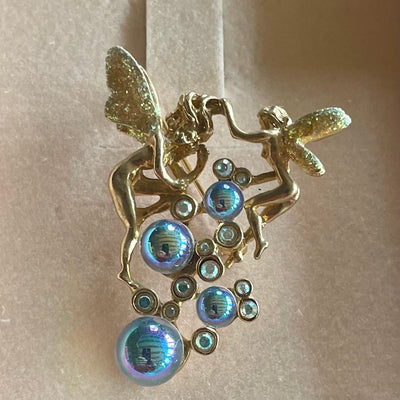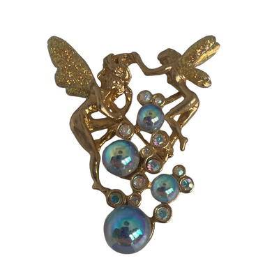 Two fairies, their delicate wings shimmering with stardust glitter, sit atop iridescent aurora borealis glass orbs of varying sizes, evoking the magic of floating bubbles. The fairies are possibly washing each other's hair. The brooch is set with a twinkling array of clear crystals, adding a touch of celestial sparkle to this captivating brooch.