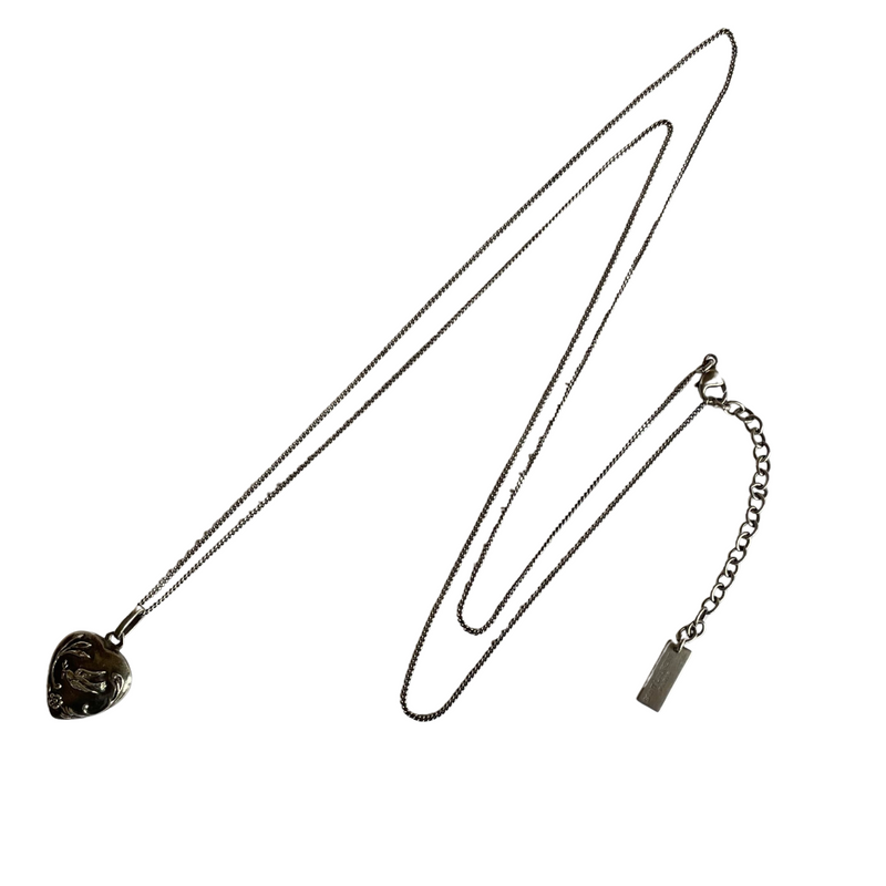 This timeless piece showcases the iconic YSL heart motif with a beautiful symbol of peace delicately embossed onto silver-toned metal. The pendant hangs from a fine chain, creating a classic and meaningful accessory.