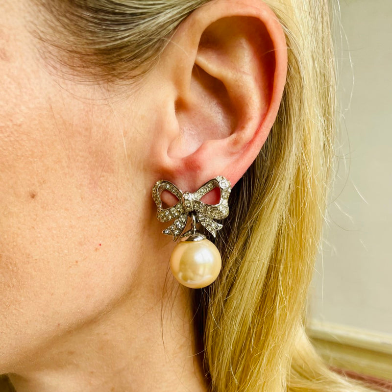 A chic pair of vintage earrings featuring sparkling crystal-studded bows with elegant, lustrous faux pearl drops. Fitted with posts for pierced ears.