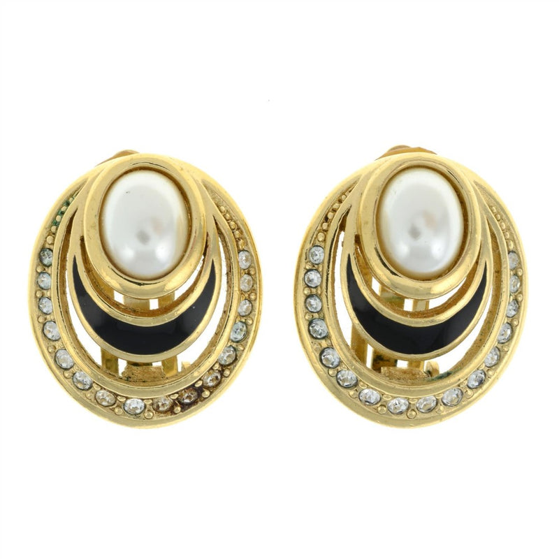 A stunning pair Christian Dior gold-plated earrings with faux mabe pearls, black enamel and pavé set crystals.