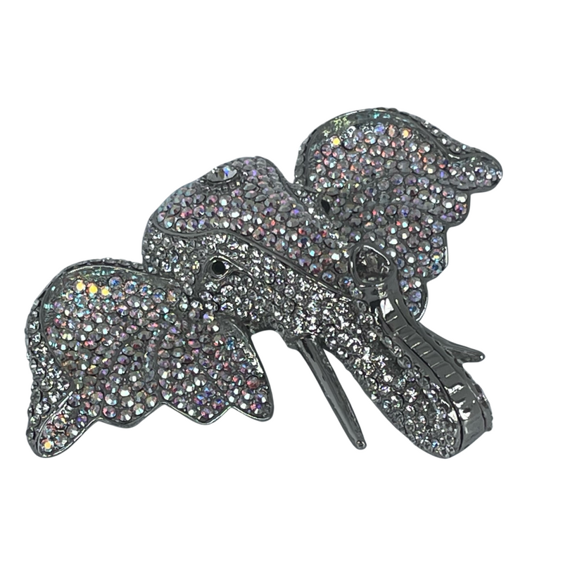 Crafted in silver tone metal, with myriad pavé set aurora borealis crystals covering the ears, trunk and face, with jet black eyes.