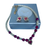 The necklace has a central faux cabochon ruby heart shaped pendant surrounded by clear crystals. The necklace is strung with beautiful quality faux pearls, interspersed with crystal studded rondelles and faux rubies.