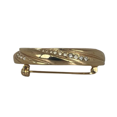 The oval brooch features rows of crystal swirls interspersed with gold-plated swirls. The brooch is fitted with a secure rollover clasp and is in very good vintage condition.