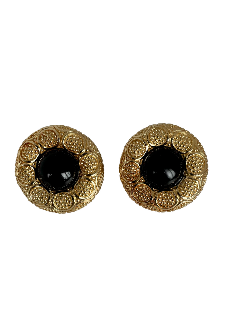 The gold-plated earrings feature beautifully detailed polished circles with gold beading inside and set with a central black onyx glass cabochon.