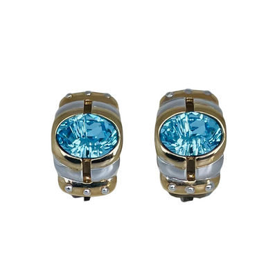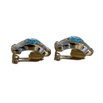 A beautiful pair of vintage clip earrings each set with a remarkably realistic faux oval-cut aquamarine crystal, beautifully faceted to catch the light and sparkle with brilliance. The stones are framed by alternating bands of gold-plated and rhodium-plated metal.