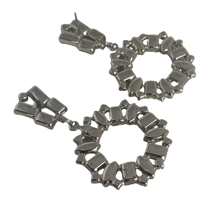 Crafted in silver tone metal with emerald cut baguette crystals, the stud earrings feature shimmering chandelier hoops - evening wear for your ears.