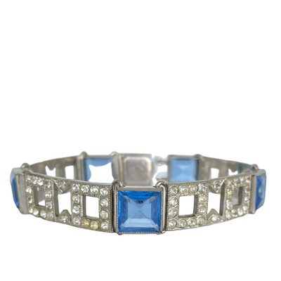 A lovely art deco bracelet dating from the late 1920s/ early 1930s with square cornflower blue stones interspersed with geometric triple square paste-set lozenges in silver-tone metal.
