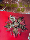 This stunning large brooch featured in the collection; it is crafted in alternating polished and textured gold metal with sections set with vibrant red Swarovski crystals. The centre of the brooch features the Prince of Wales feathers, encircled with black enamel and overseen by a golden dog. It features in the Butler & Wilson 40th anniversary book.
