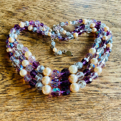 Crafted with deep purple amethysts, lilac amethysts, clear/grey crystals and real pearls.