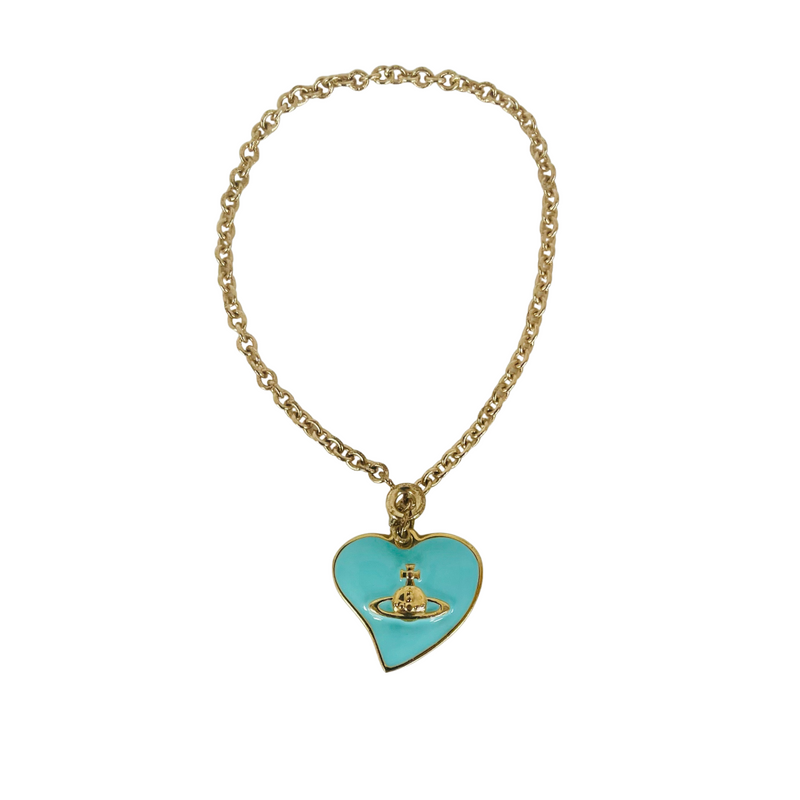 The gold tone bracelet features a turquoise enamel heart, with the iconic Vivienne Westwood golden orb cypher to the front.