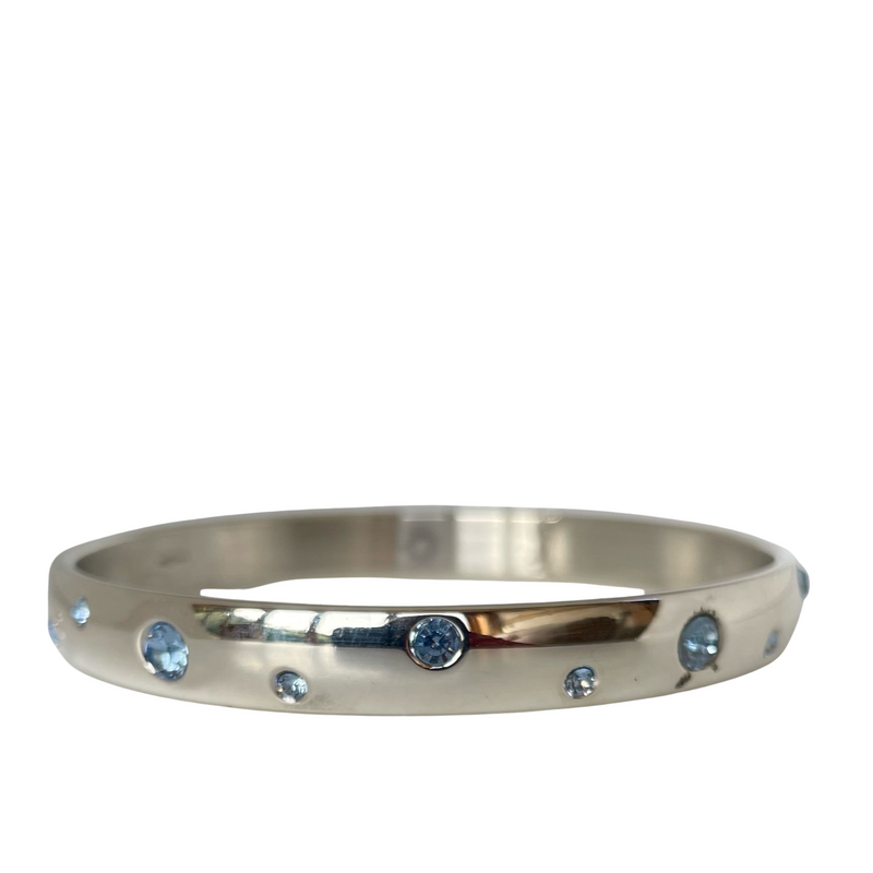 A lovely vintage Yves Saint Laurent sterling silver bracelet, marked YSL, 925 for sterling silver and Made in France. Beautiful light blue crystals are scattered over the bracelet.