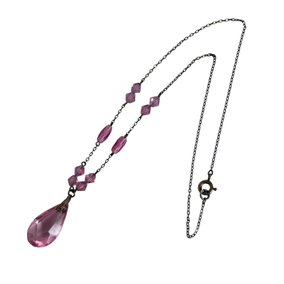 Faceted diamond- and barrel-cut stones are set along a fine gilt chain, centred with a stunning teardrop pink glass pendant. The geometric accents and central teardrop pendant reflect the glamour and elegance of the art deco era.