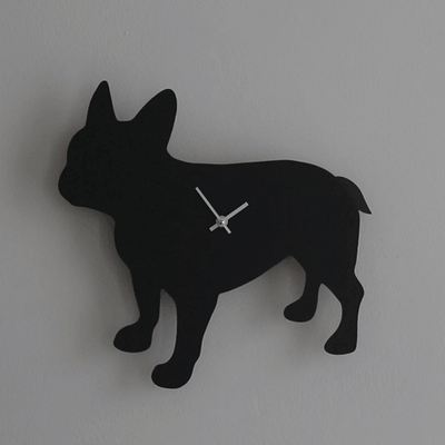 A French bulldog clock with tail that wags on the second. It is made of foamalux board with nickel hands. Comes complete with battery. Can be wall mounted on a nail or propped up against the wall.