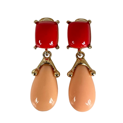 A stunning pair of 24 ct gold plated faux coral cabochon prong-set clip earrings, with a drop tear-shaped peach cabochon.