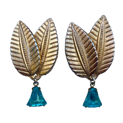 A beautiful pair of gold plated clip earrings. Crafted in the form of a leaf with blue topaz-coloured drop crystal.